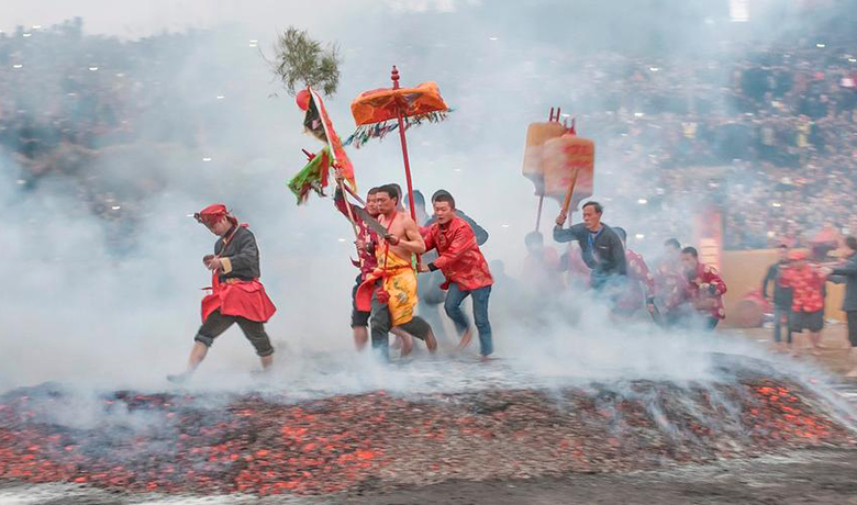 此活动历史悠久,据宋梁克家的《三山志》载:“又有舁(抬)偶像,摇兀而行,谓之‘闯神’。前列长炬,纵金伐鼓,震耀夺目。”在迎吴颜爷前,先举行隆重的“出巡”仪式,然后将神舆抬出绑在木质的双杠上,由两人抬着,数人轮流。在燃放的烟花上前进数步,又复后退数步,反复数次,有如“醉汉踉跄而行”。
