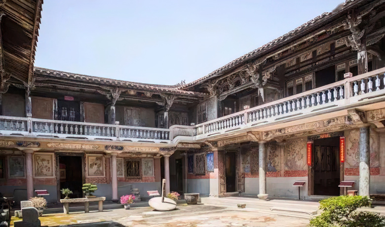 整座建筑傍山而建,与前面两座古民居连成一体。来到林氏侨厝,第一眼见到的不是古厝本身,而是门前至少三人才能合抱的大樟树。这棵大樟树已经有两百多年的树龄了。而这样的樟树在侨厝前后一共有三棵。侨厝坐北朝南傍山而建,为前后三座二进式,封火山墙双坡顶建筑。整个侨厝占地约2000平方米,包括正座建筑、左右护厝、四座方形铳楼,侨厝整体建筑华丽气派,屋角墙头的石狮,墙檐下精美的堆灰雕塑,精致辉煌,侨厝外观是传统民居。