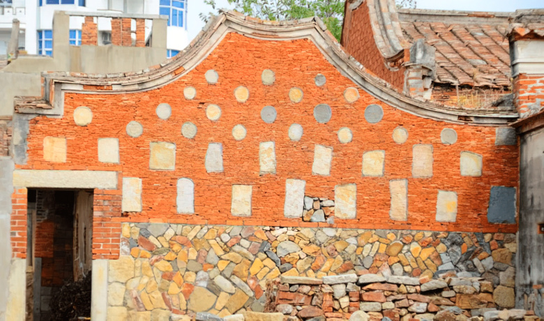 房屋两边墙面上还刻有吉祥物造型,现只剩下斑斑遗迹。正面墙体上,至今还可以辨认出当年书写的巨幅字体。三座房屋的交接处有两个宽为2米的小弄,两端均有大门,小弄不仅可以保障各座房屋的私密空间,还便于各房屋间主人往来。据介绍,基建之初之所以考虑建小弄,主要是考虑一旦发生火险,尤其是紧急情况时可以从这里逃生。