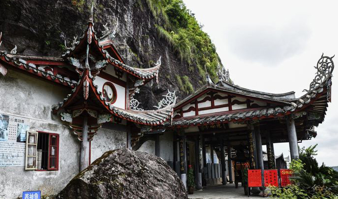 金水洞又称血盆洞,位于仙君殿左侧数十米。昔时因石壁上渗出红色的水,故有此两种名称。金水洞坐东向西,宽8.4米,深15.9米,高9米。洞内有一座祖师殿,亭式建筑,六根瓜棱形石梭柱支撑屋顶。面阔一间,进深三柱,抬梁式木构架,九脊顶,斗拱形制与华林寺大殿结构相似。殿内石佛须弥座束腰镌有“祟宁二年二月十一日”等文字。西侧凤立峰下玄帝殿、观音阁依洞而建。尤其观音阁上供奉的男士观音石像极为珍贵。