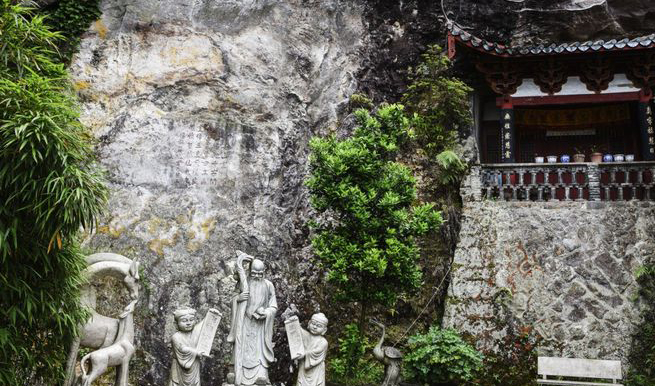 灵龟洞位于仙君殿右侧,洞壁浮雕一组,为高约2米、宽10余米的石窟造像。造像为浅浮雕,分宋、元两期。宋代雕刻残存“华严三圣”像的大象头部及象鼻等。元代雕刻当是凿在“华严三圣”像磨损之后,有“萨埵那太子舍生饲虎”“太子宣言”“鹿野苑说法”“天人赞鹤”“石佛浮江”等佛教故事系列造像,其中相传为元代民间信奉的“白莲菜”的“莲社七祖”造像,较为罕见。整体构图较为散乱,造型简朴,当出自民间工匠之手。