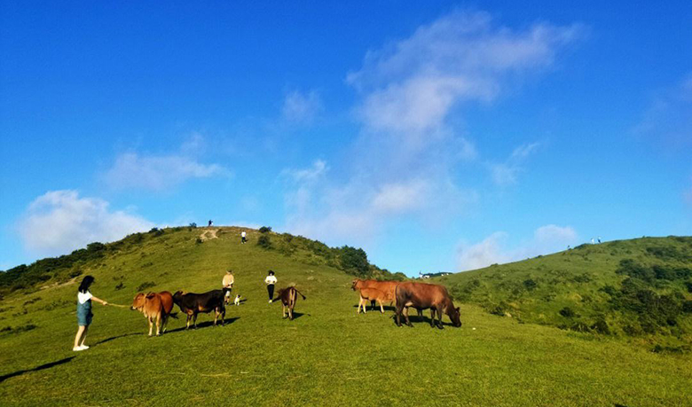 大姆山草场是不可多得的高山草甸,主峰海拔高度633米,却也连绵着几个山头,据说有八百里,看着,自然的,总是舒心的。在天底下,满眼尽是草色,山丘是绿的,平地也是绿的。小路像玉带般纵横交错着布满草场山坡。放养的牛羊一会儿嬉戏小跑着,一会儿悠闲地嚼着小草,一会儿静立不动,好像回味着草原的无限乐趣。哞哞咩咩的叫声断断续续,充满了田园诗意。偶尔还会有不怕生人的小牛犊,凑过来与你互动。看到了吗?一朵好花插在牛粪上。这恶搞的人,挺有情商!