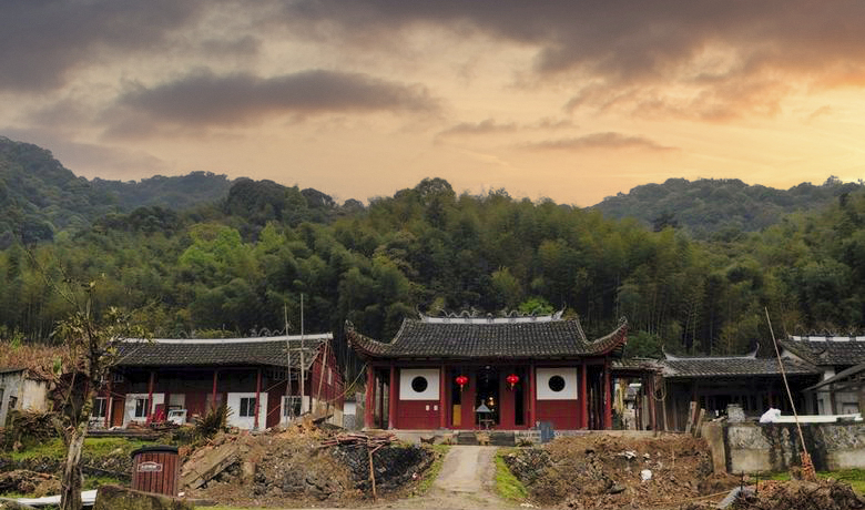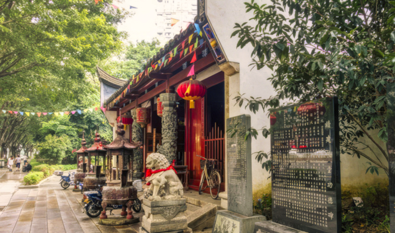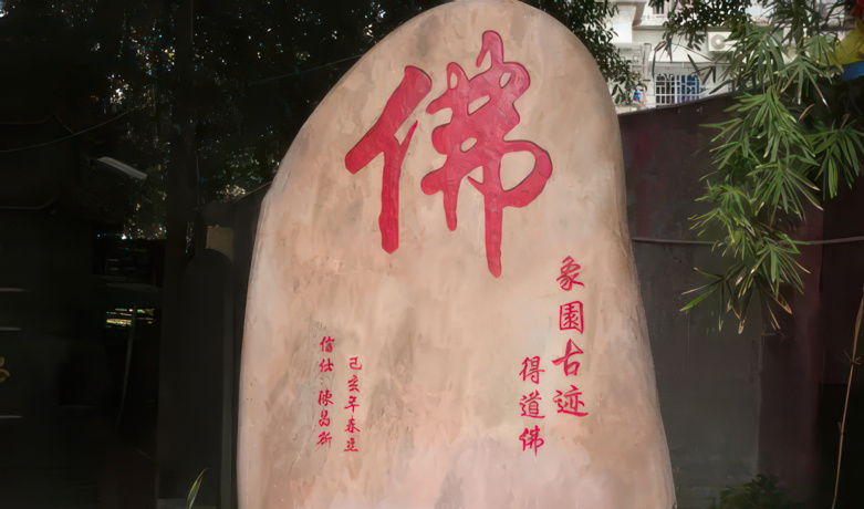 西侧是禅堂,宋宣和五年(1123 年)建,惜于1984年在重塑佛像时失火烧毁。禅堂残墙上镶着一块长0.94米、宽0.82米的碑刻。碑文曰:“皇宋癸卯宣和五年上元,起手凿山理地,基高一十五尺,深八丈;架屋三十间,用银一万四千余两。住持嗣祖善光大师希照题记。”楷书,字径7厘米。北边是观音阁,寺内有月桂飘香,外有古树环抱。寺内外已难寻唐朝古迹,但银杏、红豆杉、酸枝、罗汉松等名木比比皆是。