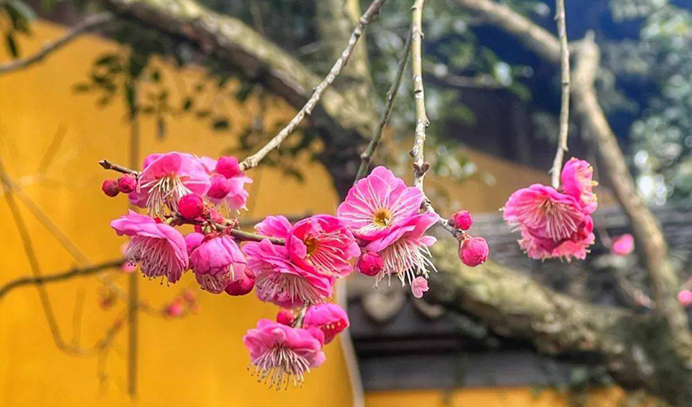 这个时节,永泰满坡满谷的青梅开得惊天动地,而相怀梅园的宫粉梅、朱砂梅则大多落叶孕绿、含羞蓓蕾。唯有吸江兰若景区(舍利窟)坡下几棵宫粉梅凌寒独自开,引得游客争相合影,好一个“人面梅花相映红”。