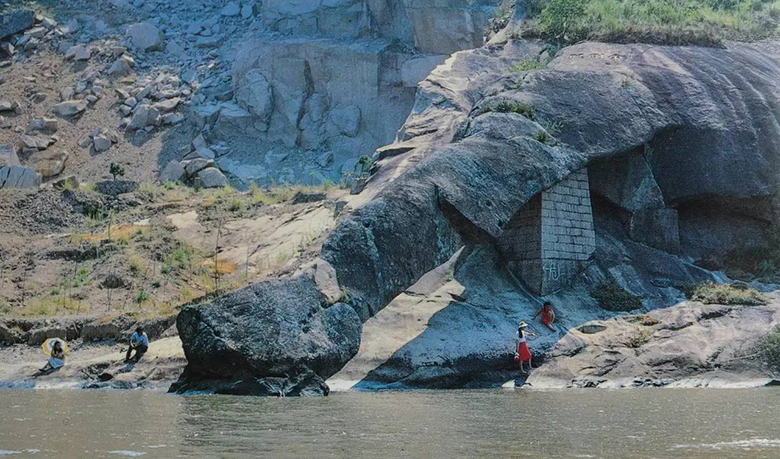金刚腿位于闽江下游福州长乐区航城的石龙山峭壁之下。它是一条从山麓一直伸到江面的花岗条岩,形如金刚天王的大腿,脚底穿靴,脚尖跷起,故被称为“金刚腿”,十分形象。金刚腿处于闽江江水和海水分界线上,这条“腿”两侧的水有咸淡之。金刚腿附近江面宽达450米,水深50米,每秒能通过2万多立方米水量,是上游台江地段的10余倍,但历来大水都不会淹过金刚腿的脚踝,故有“大水淹不过金刚腿之说”,它因而被人们视为洪水峰高水位和闽江航行的天然标志。