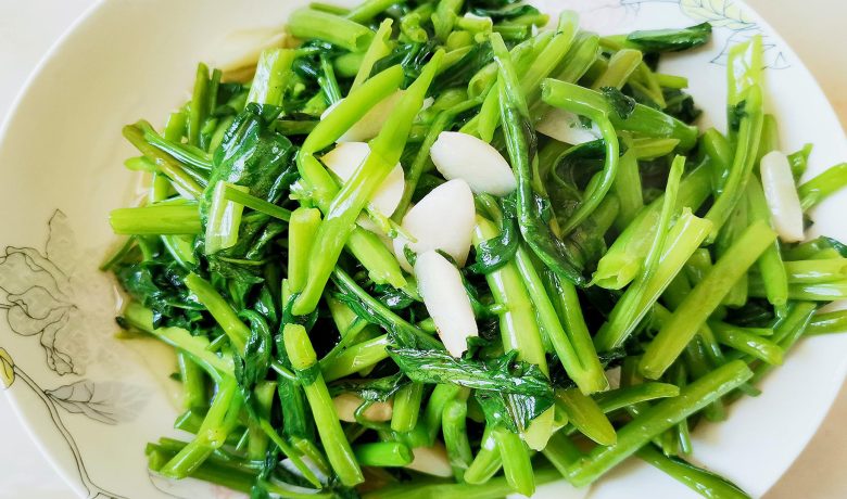 小满有三候,一候苦菜秀,二候靡草死,三候麦秋至。小满天气炎热,喜阳的苦菜日益繁茂,不耐热的靡草逐渐枯萎,夏收的小麦就要成熟。夏季燥热实在是养生的重要时节,“春生夏长”就是利用夏天阳气生发调理身体,如一候的苦菜秀,是通过吃苦菜清热解毒。老家的邻居们将苦菜种在花盆中,时不时摘一两片泡水喝,由于苦菜性寒,人的肠胃又怕热又怕凉,小时候常听大人们说“脾寒肺燥”也就是这个意思吧。福州吃苦菜的人不是很多,倒是闽西北、闽南一带常以苦菜熬猪蹄、小肠,成为滋补夏季的靓汤。不过,少吃苦菜的福州人却有自己独特又美味的养生选择——空心菜。