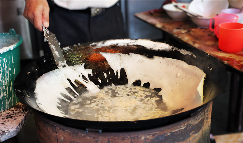 藕粉本身甜度很低,搭配上这些层层叠叠的馅料后,从内到外,使粉包汤渗透出令人着迷的甜度。包好后的粉包汤,馅料外面再裹上一层藕粉,在竹匾上不停翻滚,颇有“大珠小珠落玉盘”的意境。