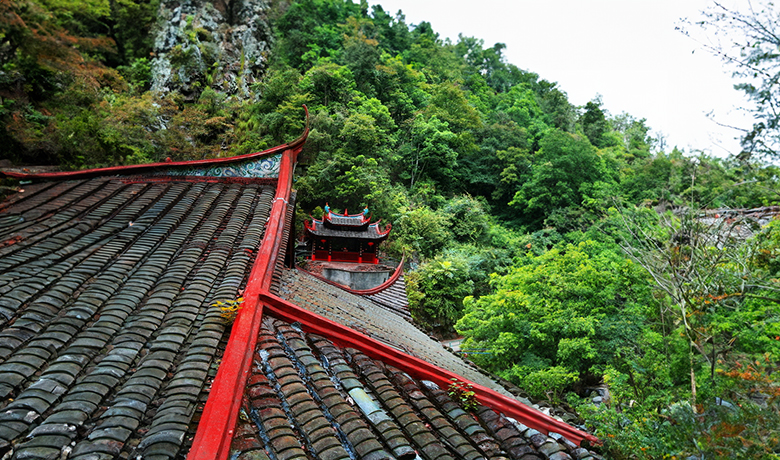 自然,慕名而来的并非都是求签问卦者流,品茗野趣者有之,瞻仰古寺者有之。溪源庵本身就是一件建筑艺术的精品。庵堂朴实无华,却揽山借水,人工、天然相得益彰。庵分上、下两殿,其间相距二百余级台阶。拾级而上,仿若登楼。下殿临溪,一道石桥接引十里花径。在庵前水榭小坐,但觉溪声绕耳,满目葱茏,仿佛整座溪源庵正在水光翠色中静静地漂浮。上殿当峰。奇妙的是,那山峰恰像一座玲珑剔透的天然盆景。山石参差有致,崖树虬曲多姿,让人惊叹大自然竟有此杰作。凭栏下视,只见云气在殿前石阶游入游出,溪声则变得霏细如雨,一时顿感寒气袭人。两殿相隔咫尺,却让人恍如置身两处天地。
