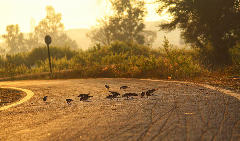 它不惧人,常集群活动,时不时一字排开,齐整地停歇在电杆线上、围墙根或埕尾鸭舍砖瓦上方;有时分散在地上、草地及灌木丛中觅食,发出“叽叽喳喳”的叫声;有时又神不知鬼不觉地出现在你面前,齐足跳动,你脚步一迈,它们又逃得无踪影。