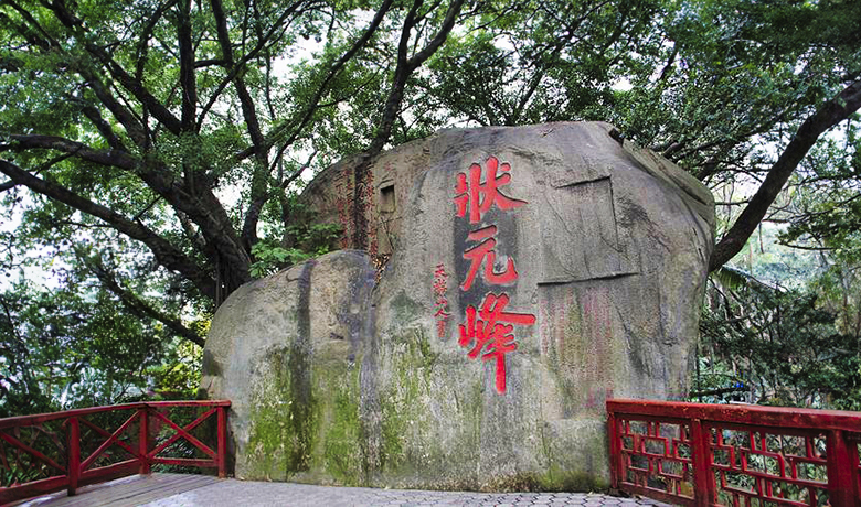 而此刻我也回眸,古庙高枕的峰头上蓦然秀出一排映山红,如红绸一展,展成天马艳艳的长鬃,在抒情,随那清冷的晨风阵阵。丛丛绝色簇拥着著名的登仙石,恰似一副天然的马鞍,相传英雄陈六公踏此石而登仙,石面上,脚印鲜明。据说英雄的故事出自汉代,古庙石头推测却为宋朝,也许从前就有了庙,又重建于宋朝?无须较真,朦胧,也是历史的魅力。
