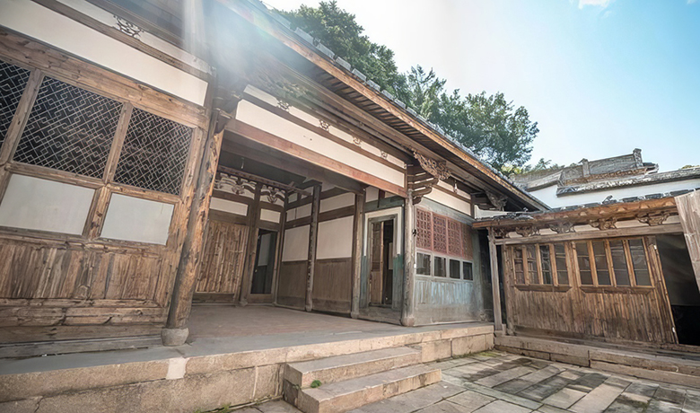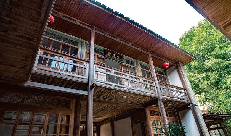 由门楼厅大门步入天井,天井北上三级台阶是深18米、宽7米的大庭院。庭院用石板铺面,两边的条石花坛错落有致,点缀着红花绿草。庭院北面是主屋,七柱六扇出游廊,有前后披榭,四周围墙。中央正门的门楣上悬挂着“忠宪第”匾额。