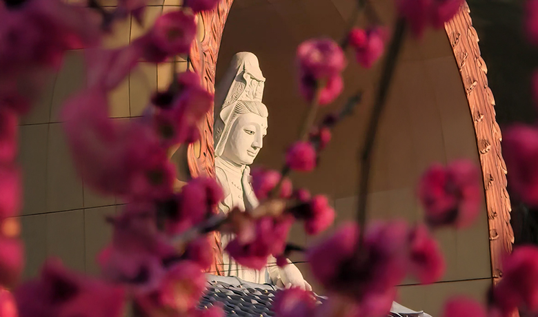 妈祖广场在长乐文石村牛山烟台顶,东临沧海,岛礁环列。从停车场往烟台顶要爬一段山路,这个季节道路两旁的红梅绚烂如霞。