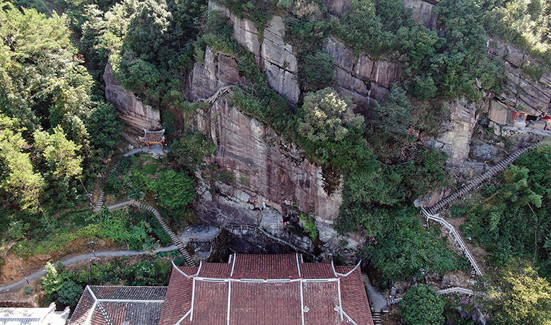 岩下早在八百年前就建有一座依山傍岩、雄伟奇险的方壶寺。与众不同的是,内供一尊与人同高的张圣君塑像。他是一位历史上有名的乡贤人物,名叫张慈观(1139—1183)。他生前随母在盘谷乡落户,经常利用上山牧牛的机会,采摘草药,为乡民治病。由于福建古时蛇害严重,张慈观学会了一套斩蛇除妖的法术。正因如此,人们在他死后为其塑像时,赋予了特殊的含意,右手握一把利剑,左手伸出的一指是一条蛇,象征他为民除害。
