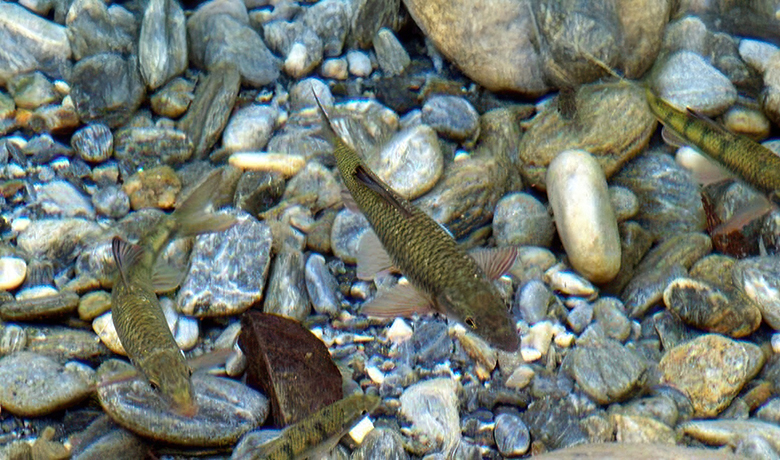 随着泡沫的推进,下游的小鱼也开始窜动,小孩、妇女们便跟着泡沫一路闹腾着去了,有经验的小伙子则耐着性子,继续守在龙潭深处。这时,大鱼也熬不住了,开始露出宽宽的、浅青色的鱼脊,见到人影后,慌忙打个水花又勉强沉入水底。到了这份上,你只要能沉得着气,它终究还是要上来的。果然,不一会儿,实在熬不住的大鱼便歪斜着身子、半浮半沉地在水中乱窜。到了这火候,往往会在好几处同时出现大鱼,让你顾此失彼,应接不暇。当然你只能瞅准一处,眼疾手快一捞网打去,准能逮个正着。运气好的话,还能遇到如小孩子胳膊大小的淡水鳗呢。逮大鱼纵然很让人激动,但却很少有大呼小叫的,人人都屏住呼吸沉住气,再高兴也只能藏在心里头。因为“战机稍纵即逝”,随着上游清水源源而来,大鱼很快就会清醒复活而潜入深潭。