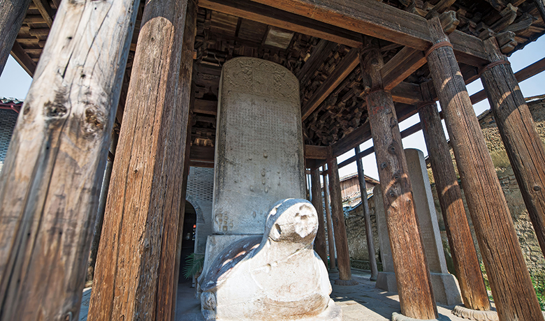 迈出宫庙青石砌就的大门,一缕清风拂面而来,静听庙语,仿佛在轻轻诵读那本属于自己的书,深情演绎千百年来的沧桑巨变。庙门的左侧就是“御碑亭”,高9.8米,由16根大木柱立地支架。由于年代久远,这些亭柱颜色深褐,纹理枯槁,像是老人干瘦的手。亭上盖着青色小瓦,四角蚩吻兽头,具有辽金时代北方木亭的风格,在南方实属罕见。亭子中央,一座巍峨的石碑静静伫立。此碑东西朝向,通体白色,高达6.5米,宽2.1米,比常见的古碑都要高大许多,彰显皇家气派。在福建省内,此碑堪称现存之古碑中的佼佼者。石碑为明成祖朱棣御赐,立于明永乐十五年(1417),碑顶半圆;上刻篆字“御制洪恩灵济宫之碑”,碑文为明成祖朱棣下令编撰,由《永乐大典》的编写者解缙书写,大部分楷书字仍清晰可读,碑文两旁饰以蝙蝠图案,纹样精美。碑由一整块石灰岩镂凿而成的赑屃驮着,传说赑屃是龙生九子其中之一,形似龟,力大无比。不同于历朝历代名寺名庙中的赑屃碑座,灵济宫遗存的赑屃有着不一样的形态。它通体红白相间,头部奇大,伸颈昂首,只可惜上面布满细坑。旧时百姓迷信,认为这只驮着石碑的赑屃有神灵之力,从它身上挖下的石粉能治百病,于是赑屃被挖得坑坑洼洼,吻部全被挖没了。碑和亭在这里已整整立了五百多年,为福建省保存比较完好的最大古石碑和碑亭。2006年,灵济宫碑被列为国家级文物保护单位。