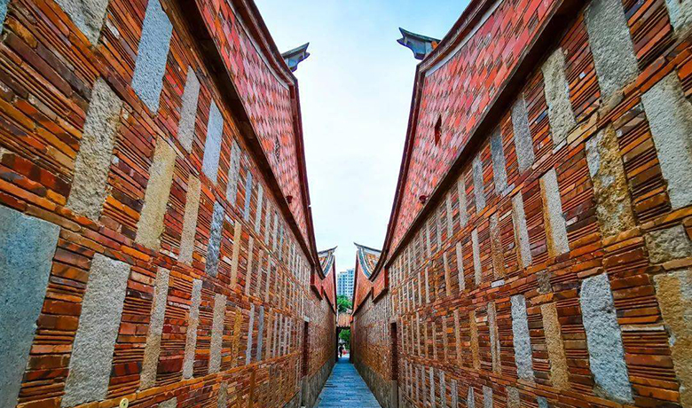 五店市是个闽南特色红砖古厝建筑群落,所有的房屋都是红砖砌墙,青石筑基,街区内遍布宗祠,寺庙、民居、商铺等100多处历史风格的建筑。红瓦铺就的屋顶上,屋脊两端如燕尾般分叉高翘,叫「双翘燕尾脊」。屋顶是闽南硬山式屋顶,红砖房屋上有各式各样的「滴水兽」。明、清、民国,晋江不少闯南洋侨胞返乡寻祖,融合海外文化与闽南建筑盖起「番仔楼」,别有特色。