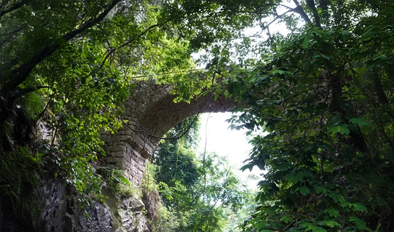 六月的阳光穿透枝叶,在桥身投下斑驳光影,那些历经风雨的条石泛着青灰色的光泽。桥长11.3米,桥面宽3.35米,厚度仅0.35米,离涧底却高达12米,净跨9米。从两岸悬崖峭壁向中间砌成半圆形石拱,远望如一轮悬于空中的满月。