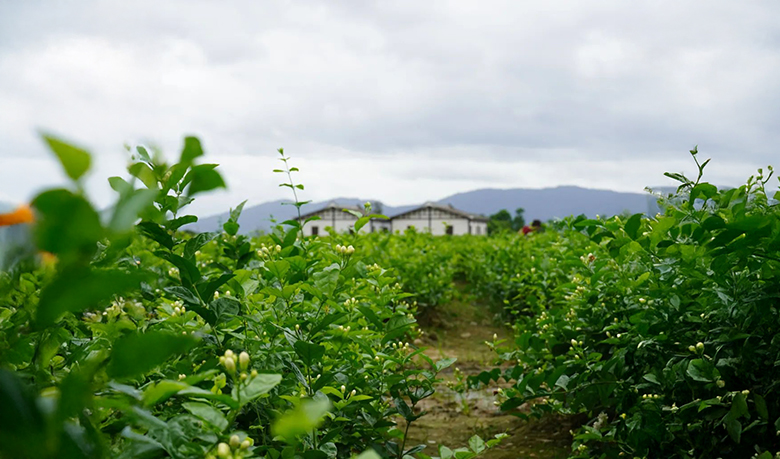 走下堤坝,茉莉花田在眼前如卷轴般展开着,绿意之上浮动着星星点点洁白的花苞。花田被划分成整齐的区块,中间留有供人行走的土埂。