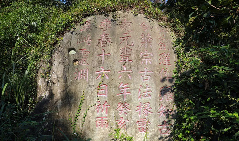 “祈雨记”石刻,位于兰亭后一块大石上。西向。石刻高2.1米,宽1.68米。楷书,纵5行,字高0.23米,宽0.21米。文:“守刘瑾、张知古、令叶宗古、法掾雷尧,元丰六年癸亥季春十六日祈雨至此灵渊。”(注:刘瑾,字元忠,江西永新人。)