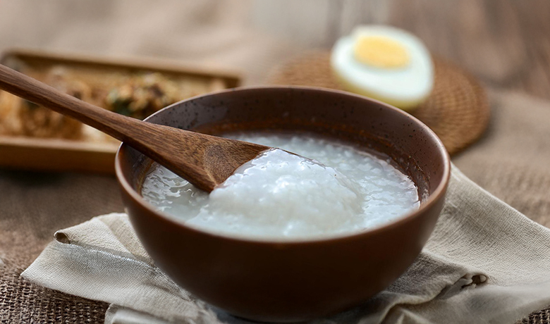 刚出锅的粥汤表面结着一层完整的米油,我用勺子将之挑起送入口,感觉就像绸缎般滑入嘴里,一股浓郁的米香立刻溢满口腔。粥粒已经完全化开,却又不是毫无灵魂的清汤,而是黏糯适中的糊状,吃完满口生香。