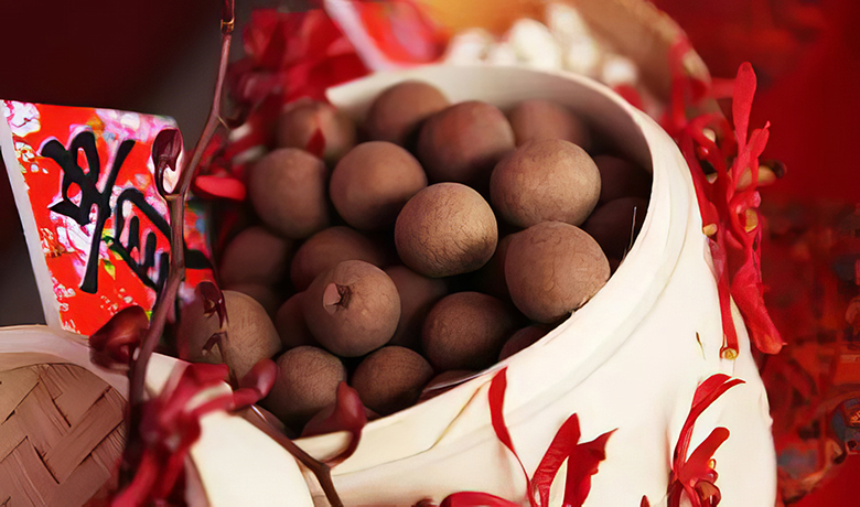 在闽南地区的婚礼习俗中,桂圆还是不可或缺的传统结婚信物,被赋予「富贵圆满」、「早生贵子」的感情色彩。在永安、南平一带,这里的新娘出嫁时,下花轿前,要送接亲男童一串龙眼干戴上,以示「圆满幸福、百子千孙」。在福州民间新娘出嫁,娘家人要在红桶里装上五谷、红枣和龙眼干等,让新娘一并带走,寓意阖家幸福、早生贵子。