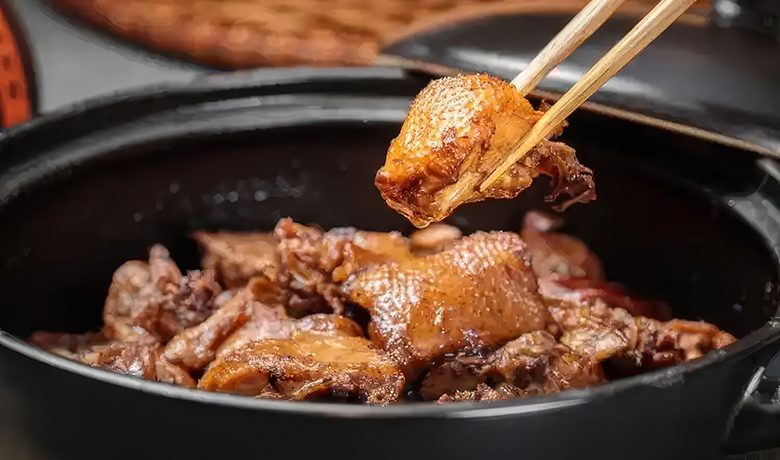 制作,是与时间的精准对话。鸭斩块后浸水去血,求一个“净”字;热锅入茶油,爆香姜葱,再下鸭块大火急炒,直至鸭皮收紧、微呈金黄,油脂溢出,与茶油交融。随后沿锅边淋生抽提香、老抽上色,使鸭块油亮红润。