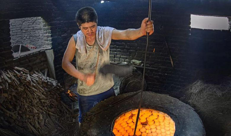 他们烤光饼用的是一口高近两米、直径约有一米的外裹黄泥的大缸。先用成捆的松枝在缸内点起冲天大火把缸壁烧“白”,缸底只剩余烬,然后把做好的饼胚,由两人合作,伸手入缸,飞快准确地贴在缸壁之上,若是迟缓一点,就怕那光着的手臂要烤出泡来。由于烤光饼时面对着的是一只大火缸,所以不分冬夏,两人都打着赤膊。他们一个递胚,一个接胚往缸里贴,身子一伸一欠,一俯一仰,动作敏捷,配合默契,再加噼噼啪啪的贴饼声,仿佛音乐伴奏,节奏感十分强烈。不消十分钟,几百只光饼便全部贴完,然后再用炭火慢慢把饼烤熟,真是叫人大开眼界。在这种大缸里烤出的光饼,只只金黄,十分香脆。