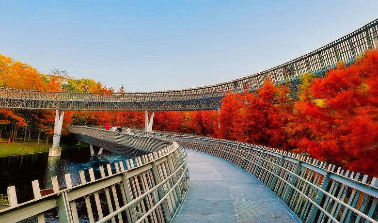 钢结构栈道顺山势攀升,与福道主线相连。从空中俯瞰,圆形、Z形与S形的线条交织成趣,宛如大地的艺术品。沿途一路美景,归水潭、风铃塔、水中栈道、山林茶室等景致点缀其间,每一步皆可驻足。阳光穿过栈道缝隙,在湖面洒下跃动的光斑,如金蝶点水,灵动生辉。