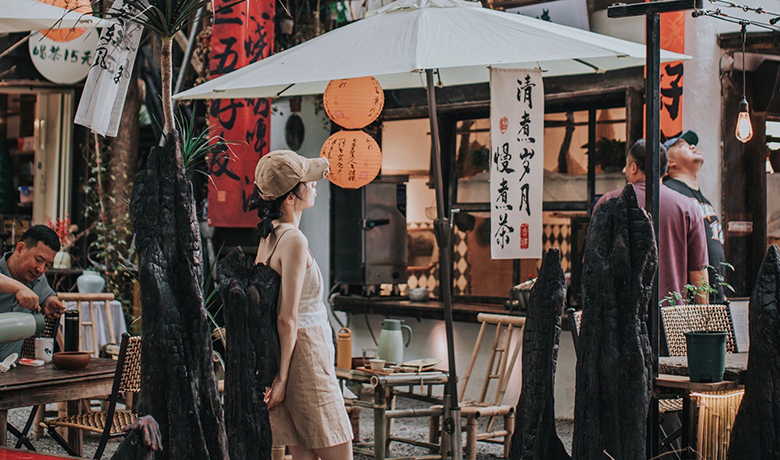 裁缝店师傅为顾客量体裁衣,剪刀在布料上游走精准轻柔,不久后一件精工细作的长衫或中山装便会完成;风灯店的竹骨纸灯各具情态,“百子千孙灯”“高照”等婚丧喜庆灯具,承载着街坊对生活的质朴期许,灯光亮起时,便将这份期许照进寻常岁月。京果店柜台里,麦芽糖的香甜扑鼻而来,礼饼、鱼丸等食货一应俱全。暮色降临时,印染店依旧忙碌,青花染、多色套染工艺让白布绽放出兰底白花的纹样,这些印花被套既是村民日常用品,更是女子嫁妆中不可或缺的珍品。