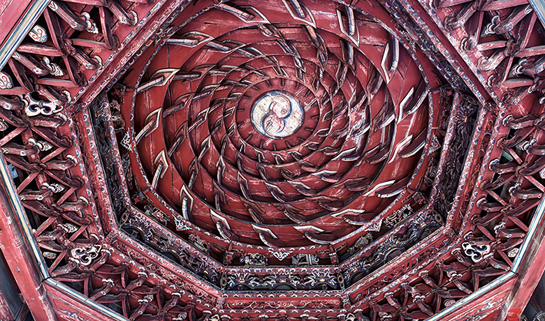 庙宇曾因修路而迁,却仍依旧制重建,仿佛将时间小心翼翼地搬运。步入其中,牌楼、戏台、拜亭、钟鼓楼依次展开,层层递进,秩序井然。而最令人驻足的,是戏台与拜亭上的双藻井——全木结构,榫卯相扣,无一铁钉。穹顶如天,彩绘与雕饰交错,仿佛把一片宇宙收纳于方寸之间。