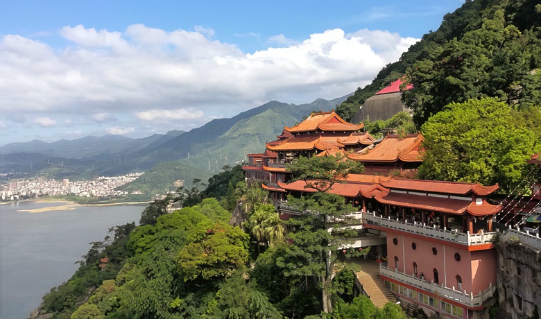 石竹山风光以石竹寺为中心,从东张水库管理局东侧走石磴上山,全程1400级台阶,8座凉亭,步行约半个多小时可至石竹寺。该寺建于状元峰下半山腰的悬岩峭壁上,一面依山、三面悬空,远望如空中楼阁,天宫仙苑。寺后群峰嵯峨,四周绿竹耸立,红墙碧瓦,典雅清幽。