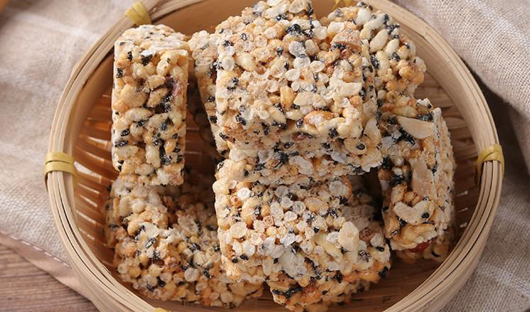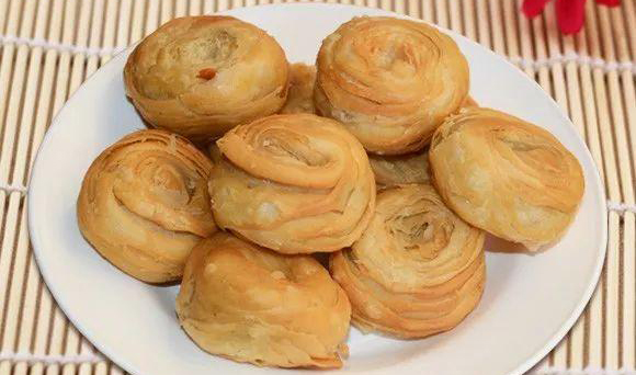 将水油面团切块、搓条,分成小块,逐块包酥,擀薄,卷成圆柱形,再擀薄卷5~6圈使呈螺纹状,用力平均切成两段待用。白萝卜洗净去皮擦丝,加少量白砂糖拌匀,挤去部分水分备用。白膘肉去筋膜,切成细丁。将炒花生仁研碎加热。面粉、糕粉先拌匀后加入白膘肉丁、猪油搅拌成绵润的馅料。将酥皮压扁包馅,再取少许萝卜丝放在馅料当中,将口包严,压扁,即成饼坯,放在铁盘上待炸。将饼坯带铁盘放入油温80℃左右的油锅中,以文火炸制至110℃,待饼浮起时翻动,炸透炸熟,捞起沥干油,放置冷却后成品码层装箱。