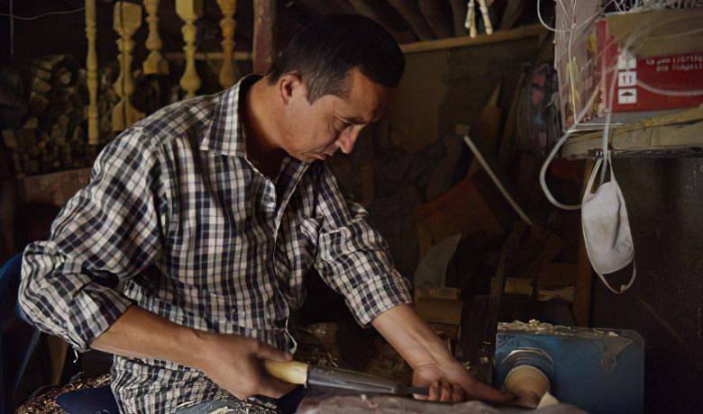 补碗时,补碗匠坐在小凳上,在破碗茬子边沿抹上少许瓷泥,把裂片照原样对接好,用一根线头上带有钩子的长线,钩住碗沿,反复缠绕扎紧,把破碗合拢成原状后固定,用标记笔点上记号,然后放在大腿与小腹之间夹住使之不动,沿裂缝的两边钻孔。“没有金刚钻,不揽瓷器活。”碗的质地光滑、坚硬,只有用金刚钻才能钻开孔。补碗匠要是没有一定的经验和水平是万万不行的,尤其是一些比较珍贵的瓷器,匠人要有更高的技术。因此这钻是补碗匠的吃饭家什,锃亮的铜钻杆,扁扁的铜尺,开钻前在钻头上蘸上清油,以防因发热而使钻头的坚韧度减弱。钻孔的动作要求准、稳、快。金刚钻绕在一张小弓的弦线上,牵动小弓,钻头便快速转动,发出“刺咕刺咕”的声音。看似破裂的碗,在补碗匠手里一瞬间便有了两排小孔,一把小巧的铜榔头将铜“码簧”依次钉入孔里。码簧是扁而长的,两头有针脚,它横跨裂缝,叮叮当当一阵敲打,然后在钉入孔的针脚处再抹一下瓷泥,碗就算补好了。补好的碗当场盛水试验,滴水不漏。