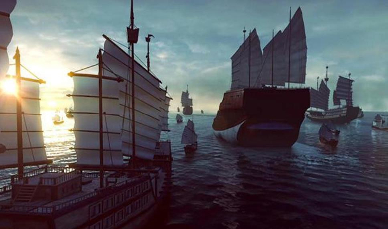 风和日丽,百花盛开。郑和在长乐知县陪同下,走过那座太平桥,来到太平港口。闽江微波荡漾,灿烂的阳光照在水面上,闪闪发光。知县端起酒杯,一连敬了郑和三杯酒,郑和接过,一饮而尽,慷慨激昂:“此番郑和满载而去,必将满载而归。”饮毕饯行酒,郑和健步登上踏板,又回头向岸上频频招手,随后拂了一右袖,大声喊:“下橹!”
