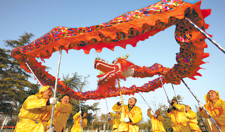 共同托举龙头一共有5个人,因为龙身那么长,‘龙头’与‘龙尾’要互相配合才会整齐好看,更重要的是不能把龙身上的棕绳扯断。为了解决这个问题,在龙头、龙身、龙尾等部位配了5个敲锣的师傅。以三声锣响为暗号。然后一起抬起龙身齐步走,敲锣声密集之时就是要停下来了。所以,抬‘龙头’与‘龙尾’的师傅一定要听锣声一齐行动。