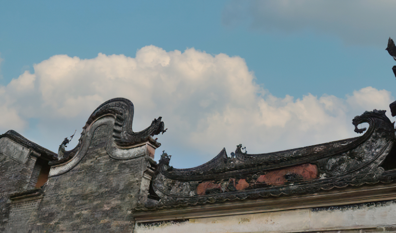 斑驳的红色墙面,灰黑的瓦片层层叠叠,靠近这群老房子仿佛走进另一段时光,沉静,又带着些微阴冷。古厝的正中央是天井,天井上有一条排水道,抬眼望去,便是纯蓝色的天空……