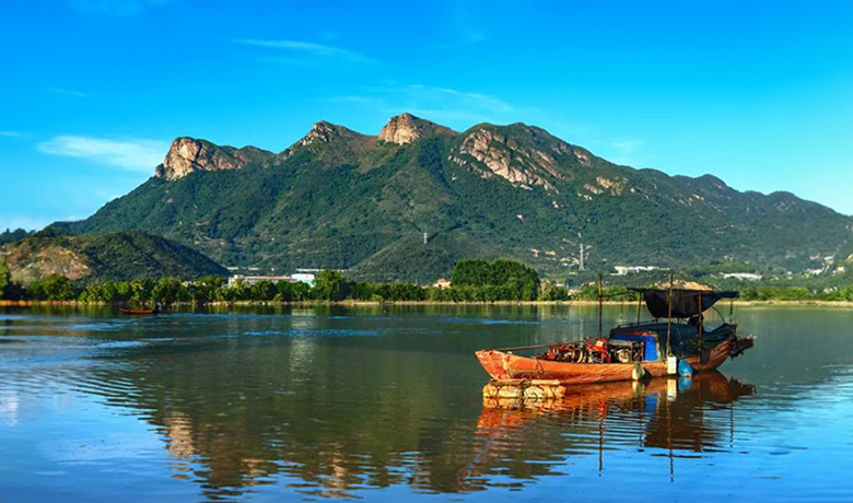 眼前的山仔水库是福州的第二饮用水源,其干净程度可想而知,岸边停靠着几只闲船,里面还有餐桌,想必是把酒迎风的好去处。