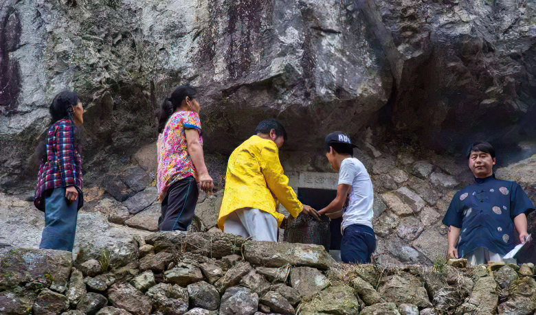 这就是传说中的“惜字坛”。坛开石门,门框刻有“字迹藏岩穴文光射斗墟”、横批“敬惜字纸”的对联。平时,石门关闭,到农历八月某天,石门开启,人们在此举行仪式,焚化有字废纸。
