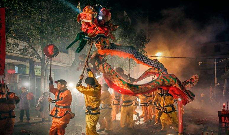 到了晚上,当野兽下山来糟蹋庄稼时,村民们就点燃火把,敲锣打鼓,舞动5 只巨大的“怪兽”,不但吓跑了野兽,还保护了庄稼和人畜安全。此后,硋灶村村民们过上了五谷丰登的好日子。于是,村民们认定这是五兽的功绩,就年复一年地在庄稼收成时分如出一辙地反复演绎,并且逐渐衍生定型出大象、甪端、麒麟、弥狮、貔貅等五兽。“上元弄五兽习俗”至此就作为神圣的宗教文化一直在硋灶村流传了下来,每年的正月初九、十二都要举行活动。