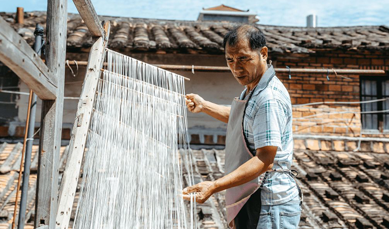 剩下的地瓜趁着天气好的时候,用手工刨成丝,清洗后过滤出来的水会变成淀粉,放在太阳下晒得雪白雪白的。这时便有人带着家什来到村子里,将淀粉加工成粉丝。晒干后的粉丝可以用来煲汤 。地瓜刨成的丝呢,晒上三五天就变成地瓜米。晒干后的地瓜米,则作为食粮,每天煮饭时,将地瓜米掺上些许大米放进锅里煮到五成熟,捞起倒进饭桶中再放到锅里蒸,约半个小时工夫,便可以闻到令人垂涎欲滴的香气了,那种甜香,我觉得是当时最好的人间美味。
