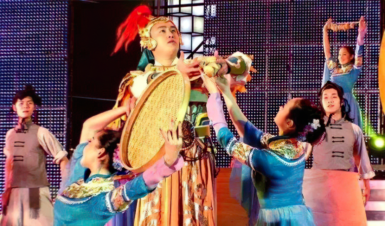 这时,戚继光和他的“戚家军”浩浩荡荡来到城外,老远就看到那些胸前系着双面大鼓、敲着欢快鼓点的小伙子们,在盛夏的烈日中正跳得满头大汗。戚继光回头命令撑着凉伞的士兵,上去用凉伞为这些小伙子遮荫。大鼓队舞到哪儿,凉伞就跟到那里,一时间,在欢庆胜利的热烈气氛中,打鼓的百姓和撑伞的将士双双踩着鼓点翩翩起舞。以后,每逢节日举行纪念活动,人们就开始打鼓舞蹈,渐渐演变成大鼓凉伞舞。