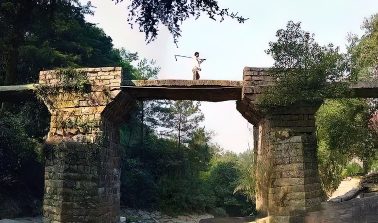 在罗宁古道的岭兜溪上东西走向架着一座石构桥,为单墩双孔平梁桥,墩与桥台由条石砌造,上有出挑,墩呈船形,桥面由两块宽0.6米的石梁并排铺就。桥全长20米,宽1.2米,桥东有石阶达于路,一棵爬满藤萝蕨草的老树沉默无声风骨铮铮守卫在桥旁,这就是十分著名的岭兜桥了。烟迷翠黛的峰峦,清旷明净的蓝天,黄绿相间的稻田,古朴深厚的石桥,红墙黑瓦的民居,藤枝缠绕的野树,倒映在水波粼粼的岭兜溪上,真让人感觉走进了水墨画中,“枯藤野树昏鸦,小桥流水人家”岂不正是它的真实写照。
