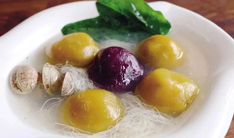 蛏滑粉采用独特的做法,将港头镇当地产的特色蛏生剥取肉,保持了蛏的鲜味,肉质鲜美; 在汤中加入了酸笋丝,鲜嫩适口,非常美味。